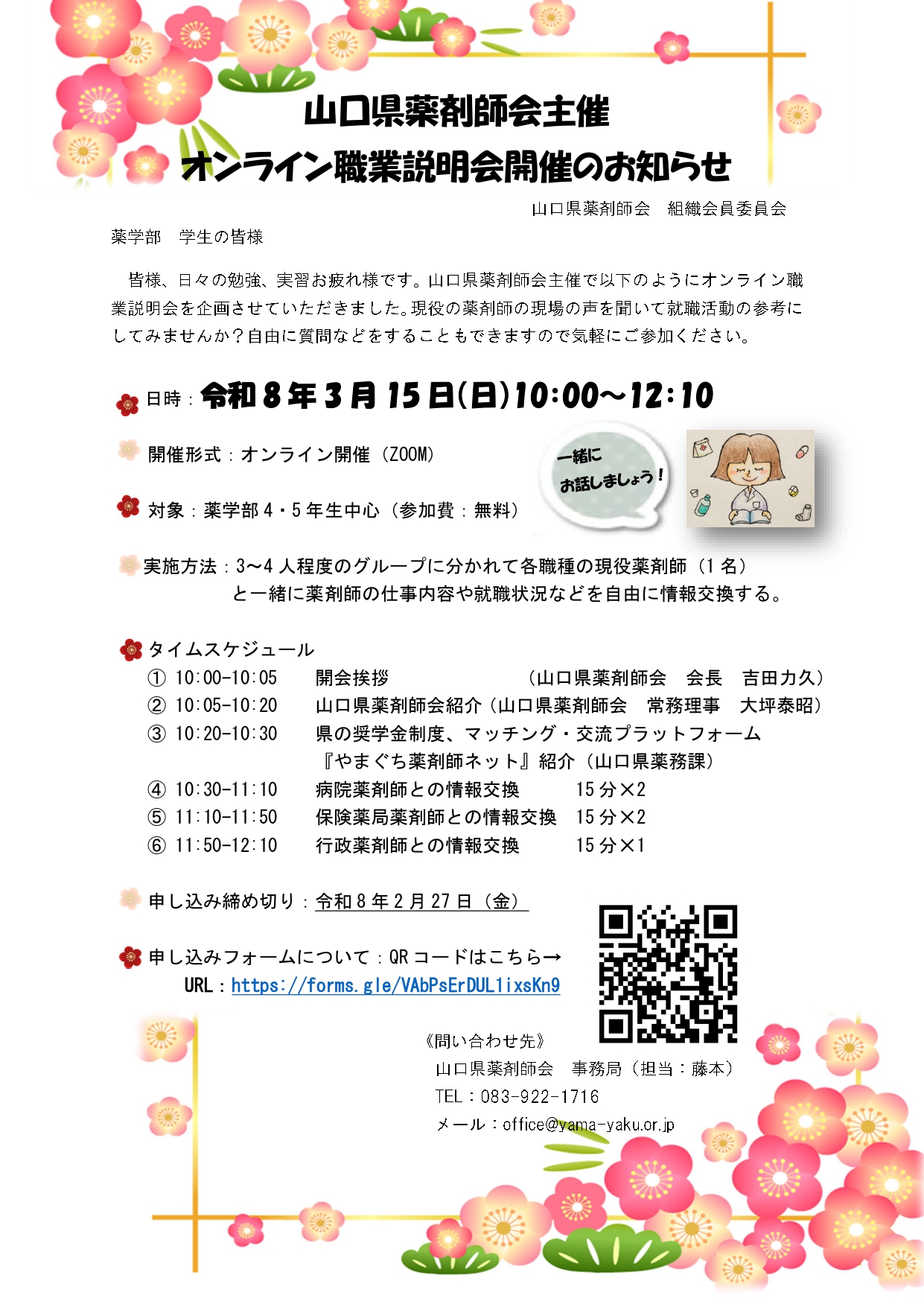 山口県薬剤師会主催で以下のようにオンライン職業説明会を企画させていただきました。